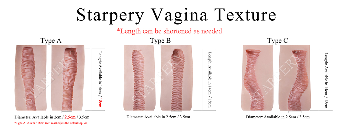 Zuvor bestand der einzige Nachteil von Starpery Doll darin, dass man Tiefe und Durchmesser der Liebesöffnung der Sexpuppe nicht frei wählen konnte. Starpery Doll, das sich auf die Benutzererfahrung konzentriert, hat jetzt drei neue Formen von Unterkörperkanälen hinzugefügt, die in die Kategorien A, B und C unterteilt sind. In Kategorie A können Sie zwischen folgenden (Radius/Länge) wählen: 2/14 cm, 2/18 cm, 2,5/14 cm, 2,5/18 cm, 3/14 cm, 3/18 cm. In Kategorie B können Sie zwischen folgenden (Radius/Länge) wählen: 2,5/14 cm, 2,5/18 cm, 3/14 cm, 3/18 cm. In Kategorie C können Sie zwischen folgenden (Radius/Länge) wählen: 2,5/14 cm, 2,5/18 cm, 3/14 cm, 3/18 cm.