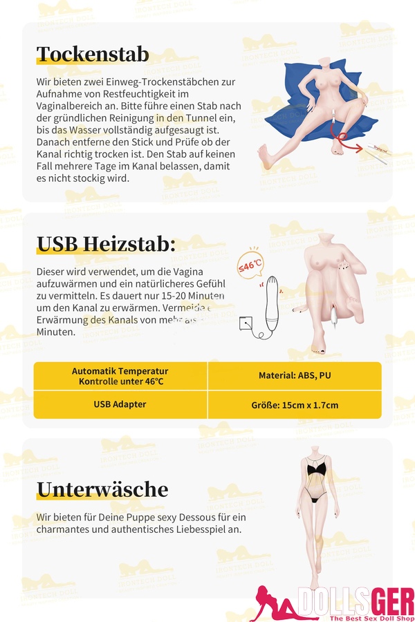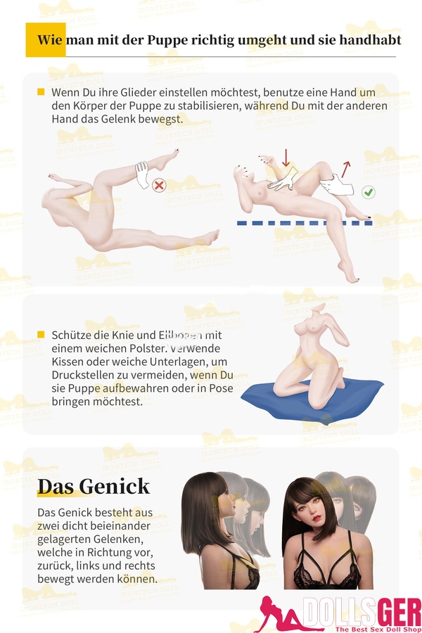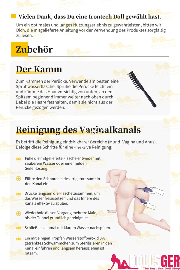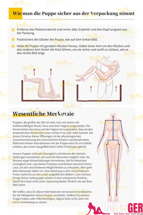 Normalerweise erhalten Sie einen schlichten Karton, der eine Reihe von Zubehörteilen sowie eine Anleitung enthält. Sie brauchen sich keine Sorgen zu machen, dass Sie die Sexdoll oder das Zubehör nicht zusammenbauen können, da die beigefügte Anleitung auf Deutsch verfasst ist (siehe Bild unten). Falls Sie eine Sexdoll mit elektrischen Funktionen gekauft haben, finden Sie zusätzlich eine Anleitung für die Roboter-Sexpuppe im Paket. Sollte die Anleitung nicht ausreichend verständlich sein oder falls Sie Probleme beim Verstehen haben, können Sie jederzeit unseren Kundenservice kontaktieren, der Ihnen ein klareres Anleitungsvideo zur Verfügung stellen kann.