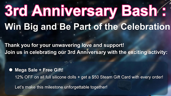Game Lady hat zu ihrem dritten Jubiläum ein sehr kreatives Event gestartet: Kaufen Sie ihre Vollsilikonpuppe und erhalten Sie einen Steam Geschenkgutschein im Wert von 50 $.